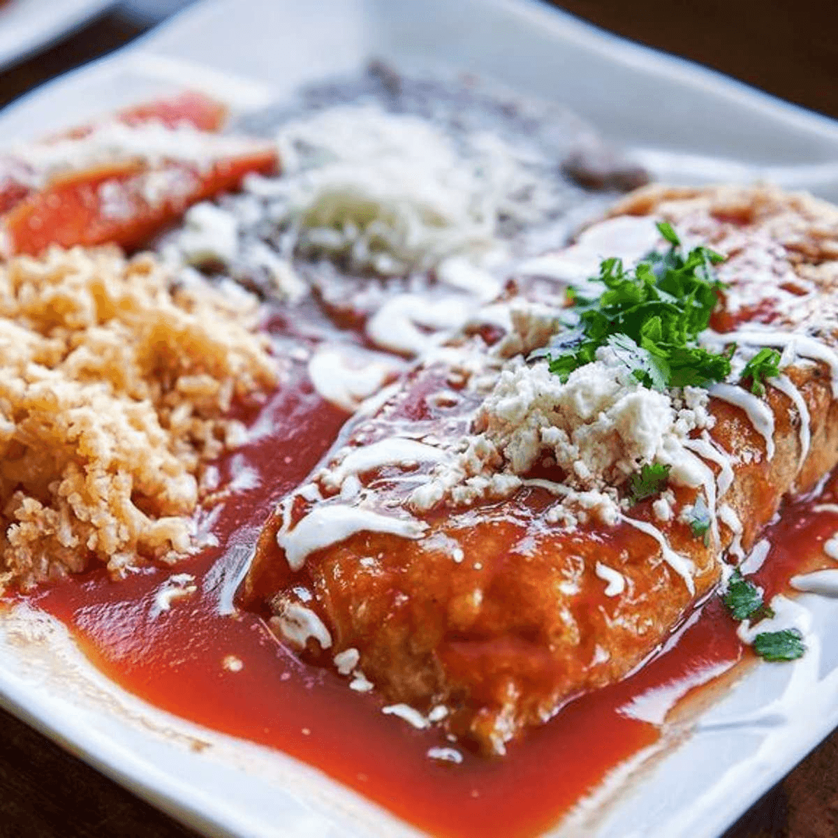 Enchiladas come with jack cheese and sour cream on top.