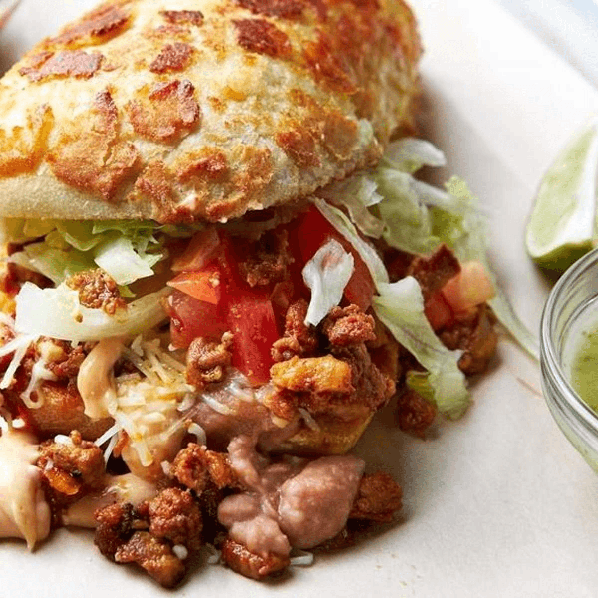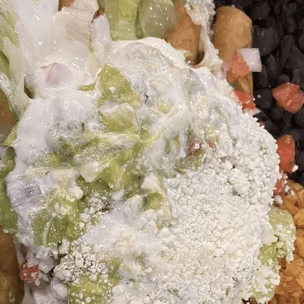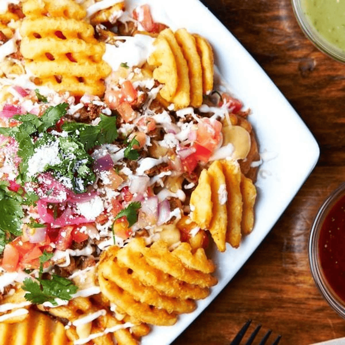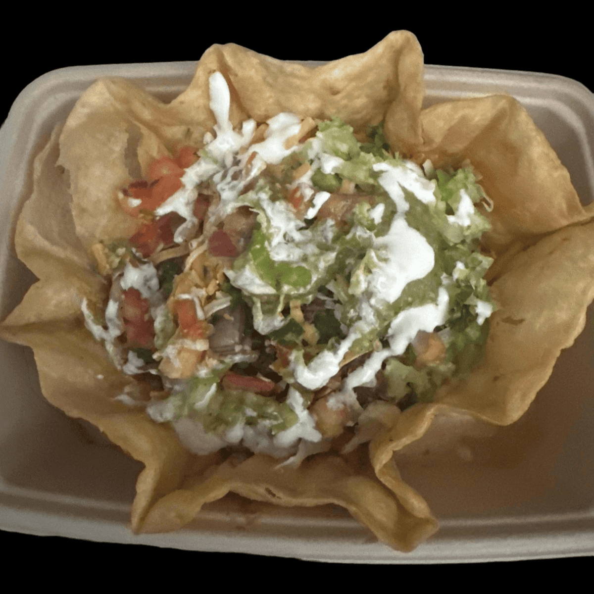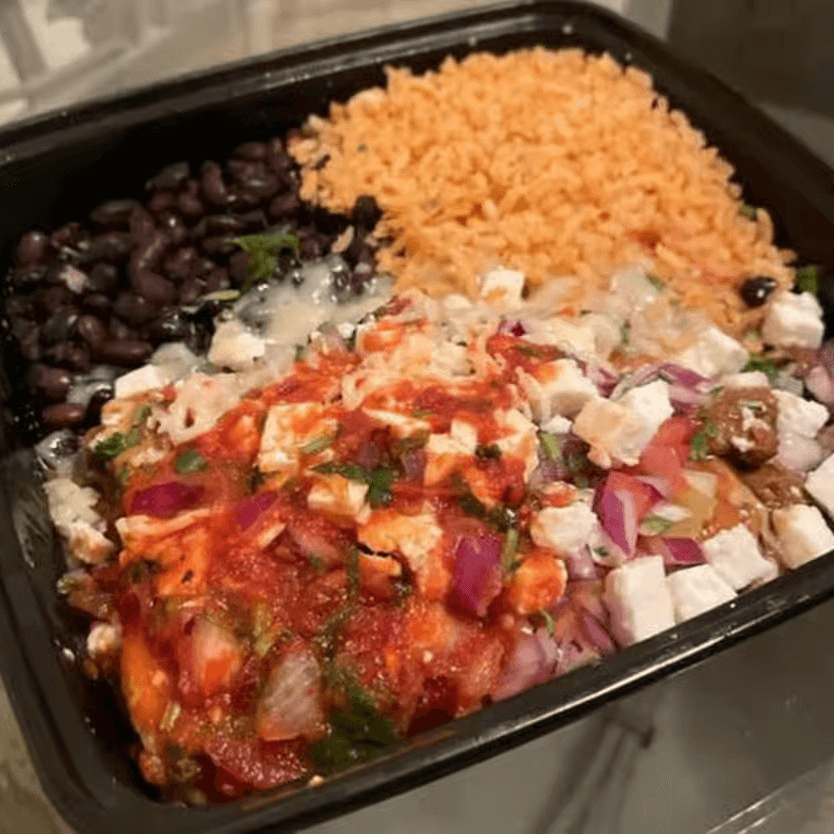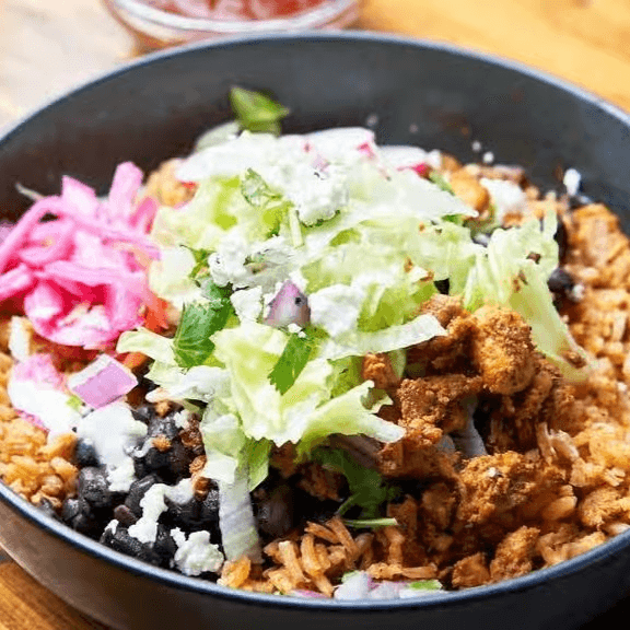 Comes with your choice of Rice, Beans and our recommended toppings: Lettuce, Pico, Sour Cream, Guac, and Queso Cotija!