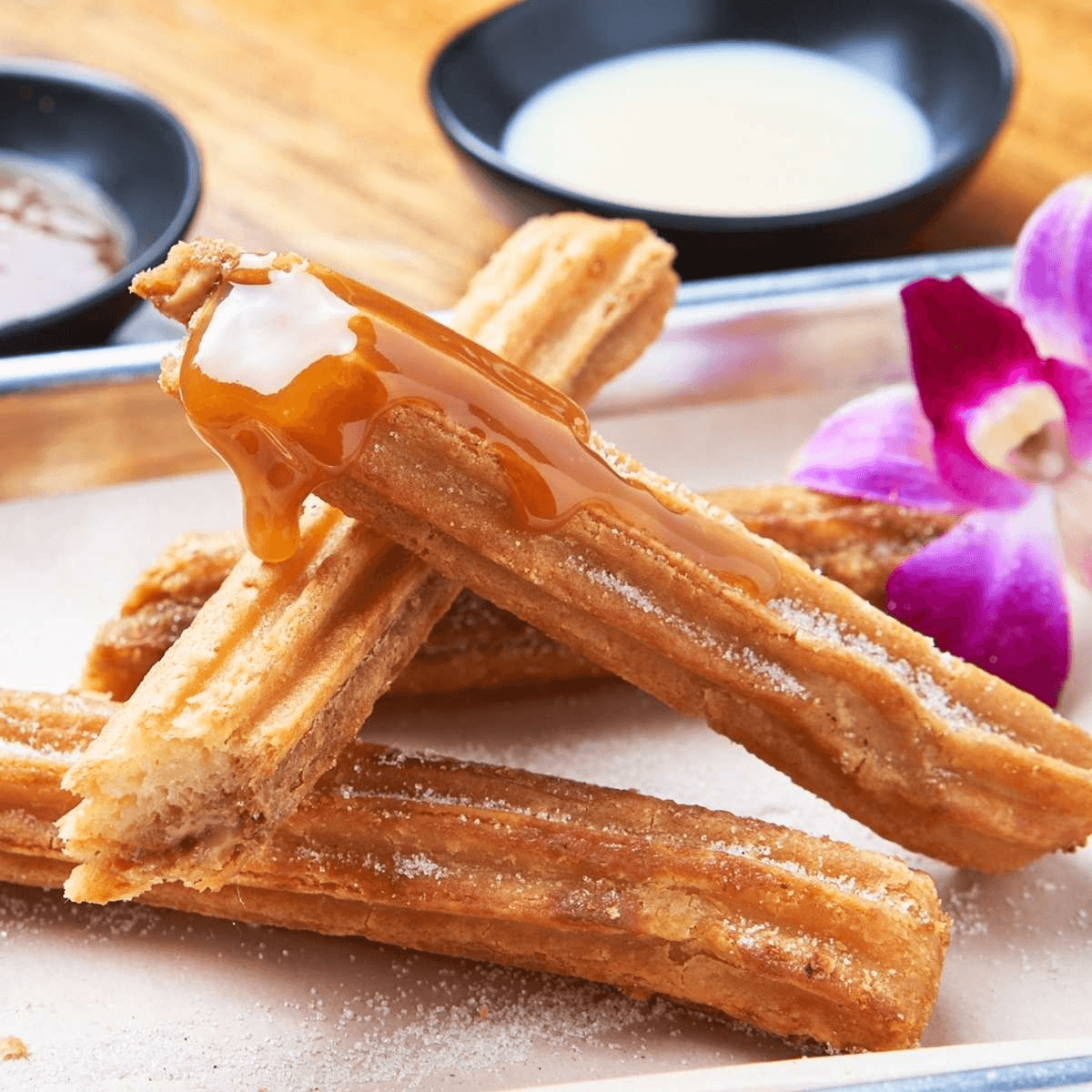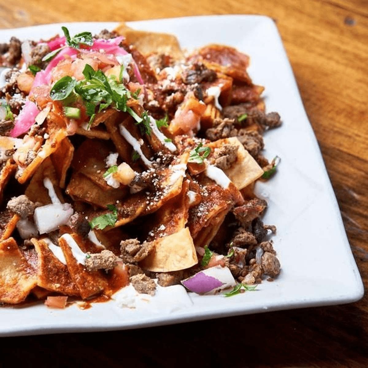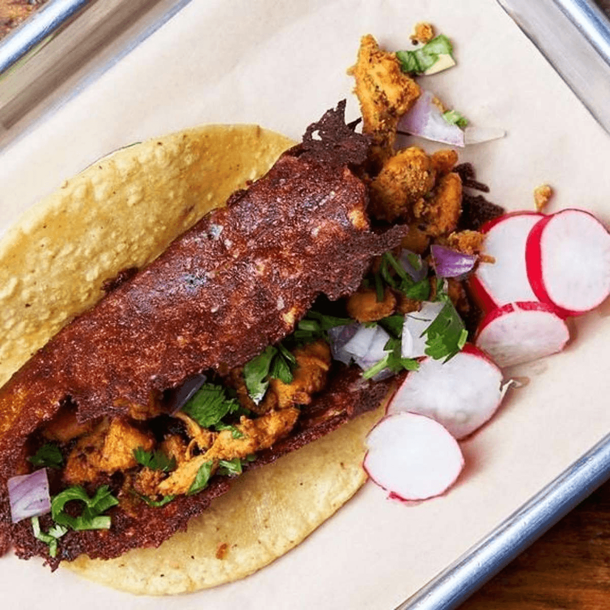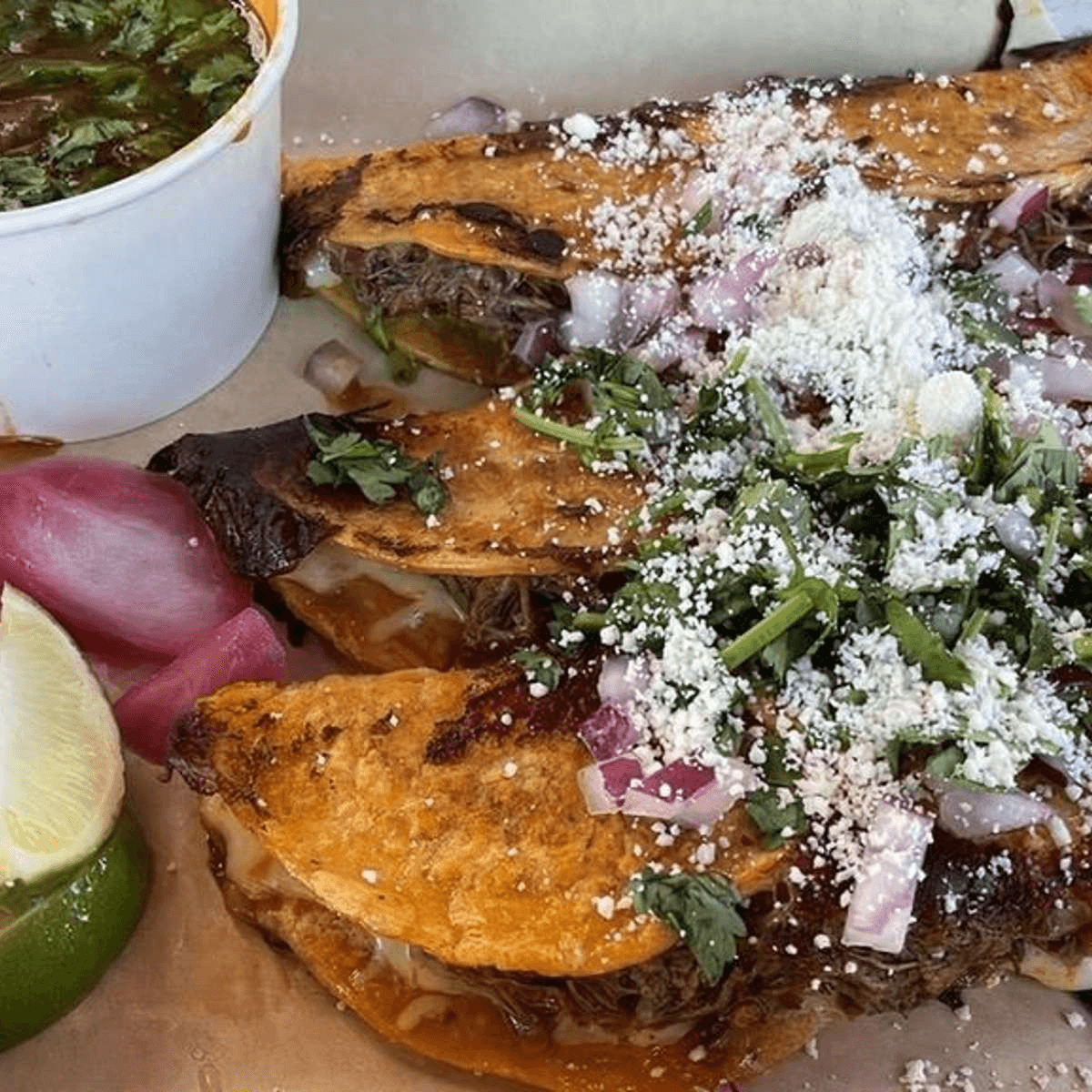 3 mini Quesabirrias topped with onion, cilantro, queso cotija. Served with limes, red pickled onions, and consome.