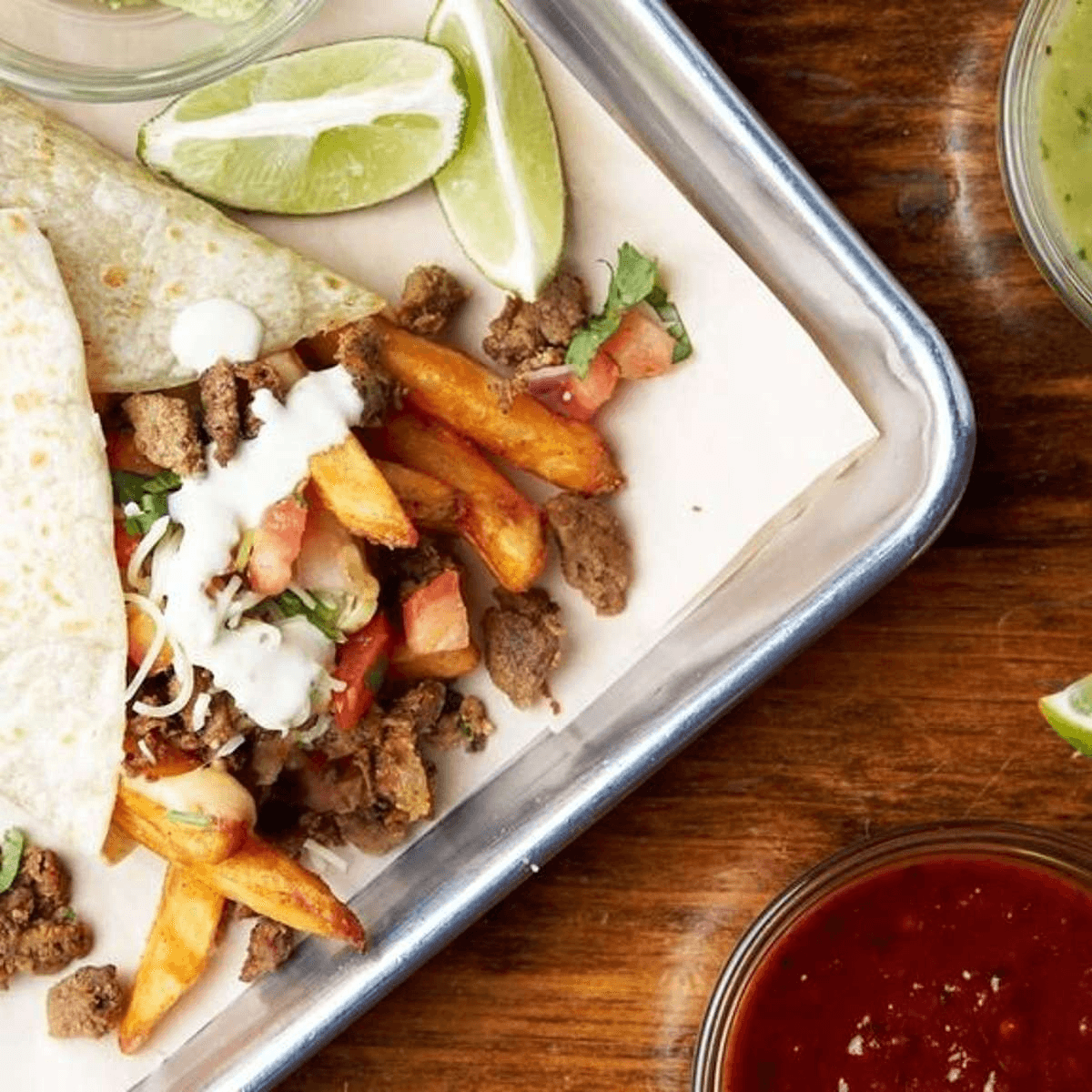 California burrito comes recommended with fries, your choice of meat, corn, queso sauce, cheese, secret sauce, serrano aioli, pico, and guac. Any option not selected will not be left out of burrito.
