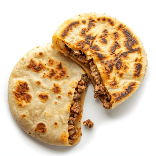 Two pork popusas with cheese, served with rice and beans