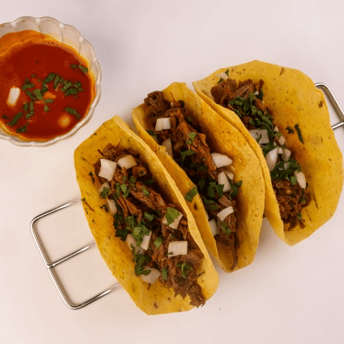 2 pieces crispy tacos with Beans and Rice.